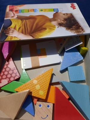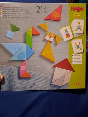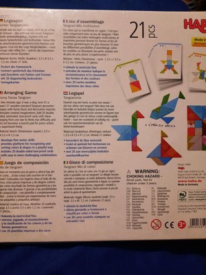 [This review was collected as part of a promotion.] This wooden Tangram from HABA is the best one I’ve seen so far, because it has the funny faces and the patterns in the blocks. The template cards make it great for the kids to see and do what is expected from them. Material is great, it has quality and is very colorful. Sizes and shapes are perfect for most ages. I recommend!