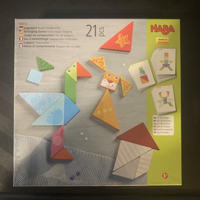 Let your child’s creativity and problem-solving skills shine with the HABA Wooden Funny Faces Tangram Set, a delightful Montessori-inspired educational toy that combines tangram puzzles with silly, expressive faces. Featuring 21 geometric wooden shapes with funny facial imprints, this set allows kids to create endless designs, encouraging pattern recognition, spatial awareness, and cognitive development. Designed for ages 3 and up, this STEM learning toy includes 20 double-sided laminated challenge cards with three levels of difficulty, providing progressive learning opportunities. Kids can follow the templates or experiment with their own unique face creations, making this preschool learning toy perfect for independent or group play. Made in Germany from sustainably sourced beech wood, this high-quality wooden Montessori toy is built for durability and safe play. Each square tile measures 1.75" x 1.75", making it easy for small hands to grasp and manipulate. Whether used for preschool STEM activities, classroom learning, or homeschooling, the HABA Funny Faces Tangram Set is a versatile and engaging wooden toy that inspires laughter, problem-solving, and hands-on creativity. Perfect for toddler learning, Montessori classrooms, and at-home educational play, the HABA Funny Faces Tangram Set is a fantastic gift for preschoolers, offering hours of imaginative fun while building essential skills. Cleaning Instructions: HABA recommends using a cloth lightly dampened with warm water. If you wish to disinfect the toy with a cleaning agent, use a small amount of either water and a mild dish soap or a water & vinegar essence mix. Both options work extremely well in destroying bacteria and cleaning wooden toys. After cleaning, wipe the toy dry with a clean cloth. Remember, Wood is a natural material that soaks in moisture. Do not ever submerse wooden toys in water or place in a dishwasher. Disinfectants (even organic baby wipes), should not be used as they can damage the water based protective coatings applied to protect the stains or paints beneath.