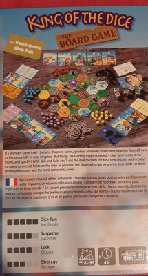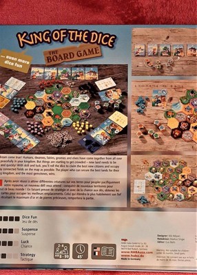 [This review was collected as part of a promotion.] Nils Nilsson King Of The Dice The Board Game was so much fun . This game is very easy to learn .It is a very fun game for both kids and adults .It is a game of chance, but strategic thinking comes into play .The kids easily understood the rules .The art work is great . The kids were ready to play again and again . Game playing includes trying to match conditions on the card with only three rolls of the dice . Each type of card gives you different benefits when expanding your kingdom . The player with the most gemstones and lands at the end of the game wins . There is fun with dice . luck, suspense, and strategy . This game kept us all entertained .