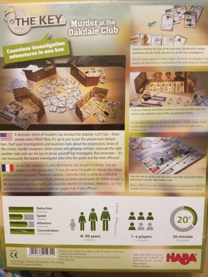 The Key - Murder at The Oakdale Club includes 4 briefcase screens, 4 dry-erase markers with erasers, 4 investigation files, 9 wooden keys, 1 solution board, and 190 cards featuring witness statements and lab evidence. Get ready to put your detective skills to the test and uncover the truth behind the Oakdale Club murders. Are you up for the challenge? Get your hands on The Key now and enjoy hours of thrilling fun! Cleaning Instructions: HABA recommends using a cloth lightly dampened with warm water. If you wish to disinfect the toy with a cleaning agent, use a small amount of either water and a mild dish soap or a water & vinegar essence mix. Both options work extremely well in destroying bacteria and cleaning wooden toys. After cleaning, wipe the toy dry with a clean cloth. Remember, Wood is a natural material that soaks in moisture. Do not ever submerse wooden toys in water or place in a dishwasher. Disinfectants (even organic baby wipes), should not be used as they can damage the water based protective coatings applied to protect the stains or paints beneath.