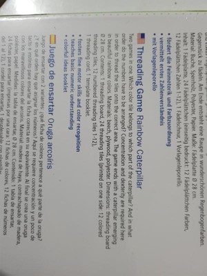 [This review was collected as part of a promotion.] The Rainbow Caterpillar from HABA is a great threading game. My children both like playing with this. I like the quality of the board and the colors are bright. I can tell a difference with my daughters motor skills after 1 month. I highly recommend this threading game