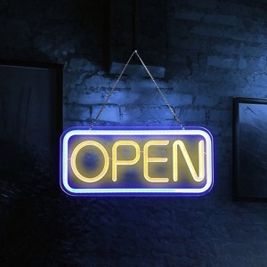 This vibrant 13"×7" "OPEN" LED neon sign features a striking blue and orange color combination, perfect for bars, clubs, and retail spaces. Crafted with premium silicone tubing and durable acrylic backing, it delivers superior brightness while being energy efficient.