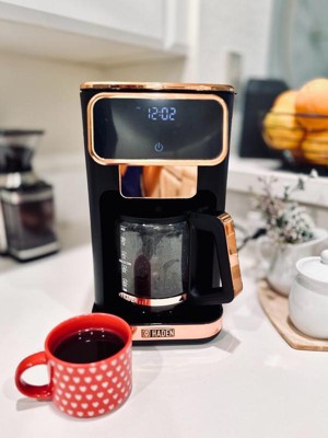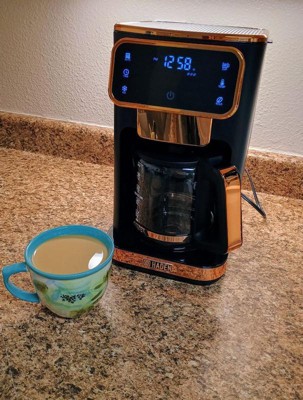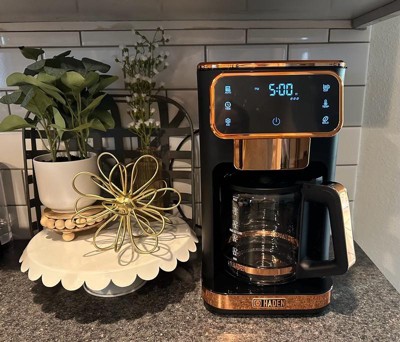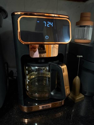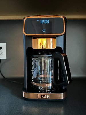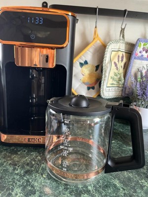 [This review was collected as part of a promotion.] Upon receiving this product, I opened the box and was immediately thrilled with just the appearance of my new Haden coffee maker. It’s very sleek, modern and the black and copper colors are simply beautiful. This coffee maker has a retro digital screen and contains a timer, the ability to determine the strength of your coffee and can make up to 14 cups. There is a removable filter just under the lid on top which makes for quick and easy use and also makes it very easy to clean. The glass portion of the decanter is lightweight yet sturdy and well made. It contains very distinctive and easy to read markings. It has a safety timer in which it will automatically turn off after two hours and it has a 30’second anti-drip function. I absolutely love this coffee maker and the price point is perfectly on for the quality, ease of use and the aesthetics it displays. The digital screen is extremely easy to use and I highly recommend this product to anyone wanting to upgrade their current coffee maker or purchasing a coffee maker for the first time.