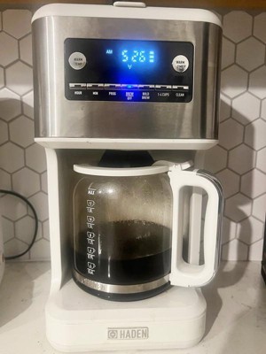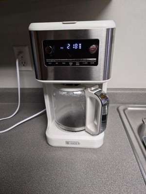 [This review was collected as part of a promotion.] Makes a great cup of coffee. Thank you Influenster and Haden for providing me a coffee maker in exchange for my honest review. This coffee maker has a great look to it and even operated better. The programming option was a little difficult to figure out, but once I did, it is very easy to program the machine to start brewing at a certain time of the day. The decanter pours extremely well and does not make the messy drips on the counter. The 14 max cups will be nice on the days that I drink a lot of coffee and I will only need to make one pot. It's very easy to read the number of cups on the decanter and the machine. Another nice option is the temp control where you can set the temperature to your specifications. Overall, this is a really nice coffee maker and I will definitely be using it every day