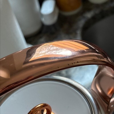 We purchased the copper/stainless version a year ago. Happy with capactiy and design but recently (and just over the 1 year warrrenty) there is a film coming off the copper handle, and it leaks from the cover when pouring, burning my hands. Paid WAY too much for such poor quality. Going to their website makes me think this is a knock-off. Will go back to well known brands.