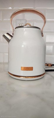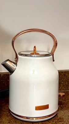 [This review was collected as part of a promotion.] I fell madly in love with this electric kettle! Heats water up supppeeeerrrr fast!!!!I swear it is faster than microwaving water in a mug (and safer/healthier than microwaving water). Its beautiful, so I can leave out ofln the counter!!! My family and I are constantly using this kettle. Perfect timing for it too, since it's fall/almost winter. Love all sorts of teas. Super easy to use, just add water and press the button! It is quiet, so no loud whistling which I appreciate since my dog can be a bit reactive to loud abrupt noises. Only things I would change, would be the little lid handle and on/off switch, I wish those were metal and not copper painted plastic. Not sure how they will do it the long run with excessive use/wear and tear. Also, I wish the main handle would be adjustable to move out of the way to make cleaning of the kettle easier. I will only use water in this. Overall though, my family and I really really love this kettle.