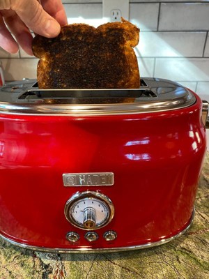 The countertop toaster operates with a self-centering function that helps hold bread of different widths in the center of the toaster. The front of the toaster features a heat control dial with up to 6 different settings to choose from. The extra-wide slots make it perfect for thick slices of toasts, bagels, frozen waffles, and more.