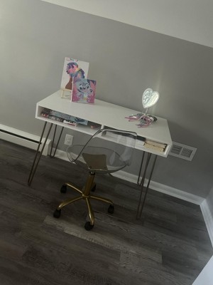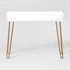 Put together a perfectly polished home office with this Hairpin Writing Desk with Storage from Threshold™. Featuring a walnut laminate finish and four brass metal legs, this writing desk pairs easily with just about any other office decor. The desk also features two open compartments that are perfect for storing books, office supplies and more to help maximize your workspace.