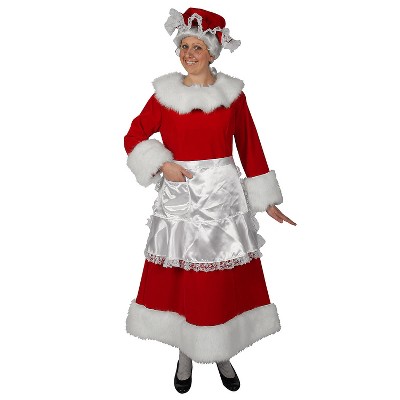 This festive dress is made of exqusite burgundy velvet with luxurious white long-hair plush trim and features a zipper in back.Dress includes a satin apron with lace trim and a mop-style hat with lace trim. Care Instructions: Hand wash cold water with mild soap. Tumble dry low. For best results hang or lay flat to dry.