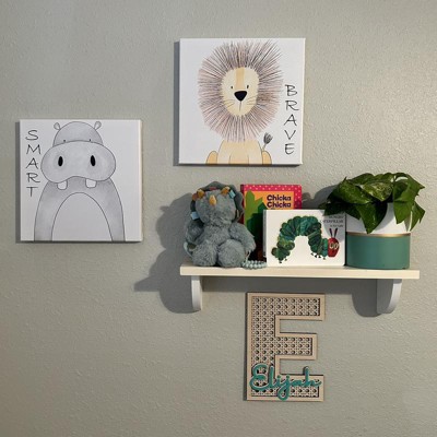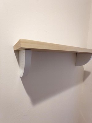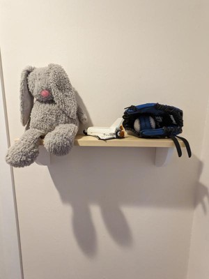 We absolutely love the simplicity of this shelf. The wood with white contrast is really beautiful. It will fit perfectly in my little ones room after we finish repainting it. Also love the simple installation. Just two nails needed to hang it on.