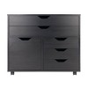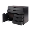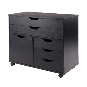 The Winsome Halifax 3-Section Mobile Storage Cabinet is ideal for all of your storage needs. With its clean, simple design, you can use it anywhere. It's the perfect organizer for your knitting, sewing, or craft supplies. Rejuvenate your garage space, mud room, or shed while providing much needed space to keep tools or sports gear organized. Or use it in a walk-in closet to expand your storage for clothing, linens, handbags and other accessories. This Halifax Cabinet features five gliding drawers with cut-out handles for easy access. The large drawers have interior dimensions of 27.5""W x 11.7""D x 2.56""H, just the place for artwork, maps, or clothing items you'd prefer to store flat and lengthwise. Three smaller drawers with interior dimensions of 13.2""W x 11.7""D x 2.5""H provide additional storage space, and taller items such as boots or backpacks can be kept in the side cabinet. The unit has five wheels, two of which lock, for easy mobility as well as a way to keep it securely in place. The Cabinet is made of sturdy composite wood in a contemporary black finish that will blend with any decor. For additional storage, combine the 3-Section Cabinet with other organizers from the Winsome Halifax collection. This item conveniently ships in 1 box and is ready for assembly. Replacement part request can be submitted directly to the manufacturer within 60 days from date of purchase.