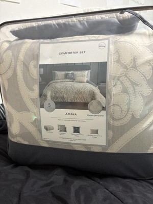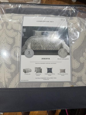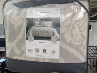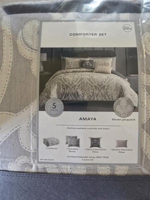 Hallmark Collectibles 5pc Queen Amaya set is very nice. I received these products for free from the Hey, Bullseye sampling program in exchange for my honest review. This full/Queen comforter is oversized. The neutral color of this airjet jacquard woven comforter set makes it easy to match your bedroom. The damask pattern is a neutral color with its intricate weaves and tonal hues. This Hallmark Collectible is a set of five pieces. These decorative pillows are beautiful they are embroidered. They have tassels and quilting. I highly recommend this Hallmark Collectibles 5pc Queen Amaya to everyone the five pieces included is comforter, 2 shams and 2 decorative pillows. You will be very pleased. Machine washable.
