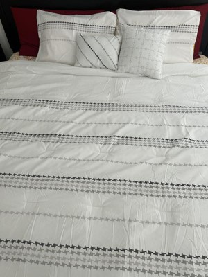 Bring this sharp, sophisticated, modern look to your bedroom with the Dephi comforter set.This 8pc comforter set is exquisitely finished with an intricately detailed embroidered houndstooth pattern in contrasting thread. The four sections of embroidery bands run top to bottow on this comforter. The filled decorative pillows add value to the set and keep the houndstooth theme going. The 8 piece set includes a comforter, 2 co-ordinating shams, 2 euro shams and 2 filled decorative pillows.