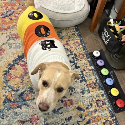 Help your furry BFF score all the treats this Halloween by dressing them in this Halloween Candy Corn Boo Dog and Cat Sweater from Boots & Barkley™. Made from midweight knit to chase away autumn's chill, this cute pull-on, full-body pet sweater features front leg openings for easy movement. Covered in candy-corn inspired white, orange and yellow stripes, this pet sweater shouts "Boo" spelled out in eerie black patches on the back. Fun and practical for the change of season, your pet will look picture perfect in this precious sweater!