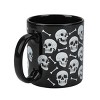 Enjoy Halloween in style with this 2-pack of 16 oz ceramic mugs. The set includes a gray mug with an all-over print of skulls and a black mug with an all-over print of Jack-o'-lantern faces. Each mug measures 3.46" x 3.27" x 4.6" and is crafted from high-quality stoneware. Both mugs are microwave and dishwasher safe, providing both festive flair and practical convenience for your Halloween celebrations.