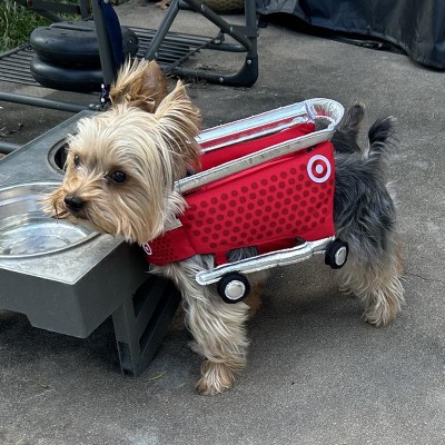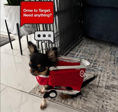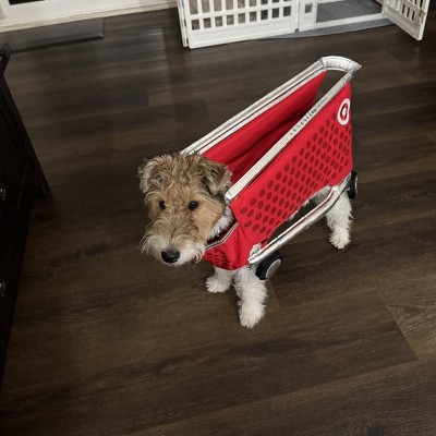 These target shopping cart costumes are super cute. I have two small Yorkies and I tried it on both of them and it fit perfectly. My one dog is only 3lbs and the other is 5 lbs. Great as a Halloween costume alternative if your dog does not like keeping costumes on.
