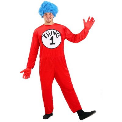 Mischief MakingFly kites indoors or have lots of good fun at your next event in this Dr. Seuss Thing 1 and Thing 2 Deluxe Adult Costume Plus Size!Product DetailsTheis bright red jumpsuit and blue wig costume is instantly recognizable to Seuss lovers everywhere! How could you not recognize these stars from Cat in the Hat? Easy to slip on with hook and loop fasteners up the back and loose enough to slip over clothing, you can transform into Thing One or Two in an instant! Comes with a number 1 and a number 2 so you can choose who you want to be!  Grab a friend and order 2!! They come with double-thumbed mitts to really flaunt your Seuss side. Top off this look with the blue wig and you will be ready to create your own mischief!The Doctor is InSometimes an occasion simply calls for a little Dr. Seuss chaos! This costume isn't limited to Halloween, it's perfect for fundraisers, literacy events, parades, and even 5ks. The Cat in the Hat and his associates can always be called on to drum up a little energy. Whatever you're up to, you're sure to have a great costume.