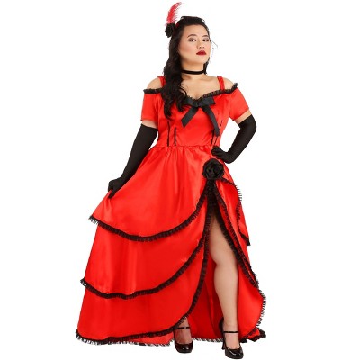 The Fun Costumes Women's Sassy Showgirl Costume Plus SizeIf you love experiencing history for Halloween, you'll love visiting a saloon of the Old West when you get this Sassy Showgirl Costume for women! Part of our line of exclusive made by us costumes, this outfit is designed to fit and feel like real clothing, and be historically accurate for cosplay and Wild West reenactments. It's the best dress to have you playing the part of a Wild West entertainer!Product Design:Our Wild West Saloon Girl outfit includes an elegant red dress designed to look like the garb worn by saloon showgirls of America's Wild West. It features a layered skirt with a thigh-high side slit, black ruffles, a black lace bow, and black faux flowers. A spandex back panel helps ensure a great fit, and it comes with a choker necklace, hair clip, and black gloves to complete the outfit!Product Details:100% polyester satin, organza, & stretch knit fabricsSatin dress has concealed zipper in right side seamStretch knit back bodice panelNarrow shoulder straps are gathered over elasticRuffled organza edging at neckline & skirt tiers, ribbon bow at center of necklineThigh-high slit at left front of tiered skirtBlack ribbon choker has hook and loop fastener at back3" diameter black foam rose pin as safety pin on backHair clip is red feather & black foam rose on metal alligator clipAbout Us:Fun Costumes are exclusively made by us and begin with passion, teamwork, and industry expertise decades in the making. Our products are proof that with the right people even a simple idea can grow into something incredible. We started in a small garage in Minnesota, providing costumes to our local community, and now we're creating costumes for people all around the world.