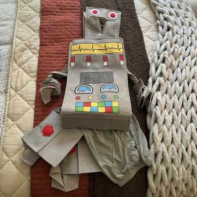 Give your child an instant technologic boost with the robot rascal costume. The featured tunic is boxy but soft, printed with buttons and meters on the front. The headpiece is adorably detailed with wide red eyes and antennae at the top and sides. The "robot claws" and boot covers easily and comfortably finish the look, simply slipping onto the wrists and ankles. With a costume this good, your kid will be dancing The Robot in no time!