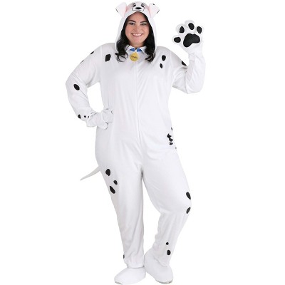 Plus Size Pongo Jumpsuit from Disney's 101 Dalmatians:Transform into the lovable protagonist pup from Disney's 101 Dalmatians with our Plus Size Pongo Costume! This officially licensed outfit includes a jumpsuit with a hood, attached mitts, collar, and tail, along with matching foot covers. Made with elastic, polyester, and zipper closure, it offers a comfortable fit and lasting quality. Crafted from soft minky fleece fabric, this costume feels like regular clothing, ensuring comfort and durability. The design features a sublimated spotted suit, a metal Pongo nametag, and Pongo's cute face embroidered on the hood. Perfect for cosplay, dress-up, and Halloween, our Plus Size 101 Dalmatians Pongo Costume will make you stand out and showcase your love for this classic Disney movie. Get ready for lots of spotted Dalmatian fun with this adorable ensemble!Product Details:100% polyesterJumpsuit has zipper down center front, elastic at ankles & wristsBronze metal dog tag on the zipperMitts sewn to sleeve cuffs flip back to free handsEmbroidered facial features on the hoodFoot covers have elastic bands to secure under the feetStuffed tail sewn on the back. About Us:Fun Costumes are exclusively made by us and begin with passion, teamwork, and industry expertise decades in the making. Our products are proof that with the right people even a simple idea can grow into something incredible. We started in a small garage in Minnesota, providing costumes to our local community, and now we're creating costumes for people all around the world.