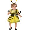 Everyone will be buzzing over how sweet your little one looks this Halloween when you dress them in this Infant Baby Bee Costume! The costume comes with three pieces for a quick and easy transformation. A black and yellow striped dress with a tulle underskirt and stitched-on bow makes it a cute outfit. Included wings attached at the back of the dress with hook-and-loop fasteners. The final touch to this adorable baby bee costume is the accompanying felt-covered headband.