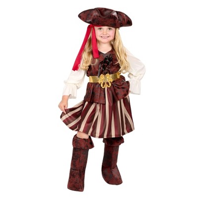 Yarr! Set sail for adventure and exploration with this Brown Coat Pirate Costume for toddlers. This brown faux suede dress has an inset bodice panel with white lace trim on the sleeves and inset. The red and white striped leggings have an elastic waistband. Also included are faux suede boot tops, a faux leather belt, and a maroon head scarf with a printed skull.