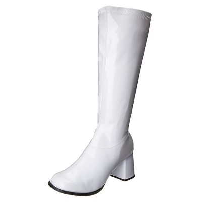 Strut your stuff with a blend of retro flair and modern style with these Adult White Patent Platform Gogo Boots. Perfect for costumes, themed parties, or just turning heads on a night out, these boots offer a striking appearance that will make you the center of attention. Made with all man-made materials, these boots are crafted with care to provide long-lasting durability. The faux leather uppers, boasting a shiny patent finish, give a glamorous touch that radiates confidence. The chunky heel, standing at a bold 5" high, and the 2" thick platform provide added height, creating a distinctive silhouette that elongates the legs. The lightly textured underside ensures a better grip so you can dance the night away confidently and gracefully. These boots are designed conveniently to feature a zipper along the inner side, allowing for easy wear and removal. The sleek design fits snugly to the contour of your legs, offering both support and elegance. Whether channeling a '60s vibe or looking to add a unique touch to your contemporary ensemble, the Adult White Patent Platform Gogo Boots offer a versatile choice that never goes out of style. Their eye-catching appeal and chic design will make you feel like the star of the show.