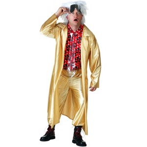 The Fun Costumes Future Doc Brown Costume"Roads? Where we're going, we don't need roads." Ever since he invented the time machine Dr. Emmett Brown has been exploring the future. He has seen who is going to become president, what will be latest in technology, and even Jaws 19. But the problem Doc had when he traveled to the future is that he wasn’t dressed for the occasion so he invested in some stylish new clothes. His new digs included a bright jacket and pants along with the super cool clear tie. What Doc also picked up were a pair of shades to match his DeLorean time machine so he can look awesome as he travels from decade to decade. Now you can look as cool as Doc Brown when you wear this costume straight out of Back to the Future: Part 2. Check out our great Marty McFly costumes so you can create a great duo look this Halloween!Back to the Future II is a trademark and copyright of Universal Studios and U-Drive Joint Venture. Licensed by Universal Studios Licensing LLC. All Rights Reserved.Product Details:Back to the Future 2015 Doc Brown Costume100% polyesterShiny tricot jacket has long sleeves and wing collarTricot pants have elastic waistbandHawaiian print shirt front has ribbon waist ties, hook and loop strip at back of collarClear vinyl necktieWig is synthetic hair on mesh capReflective plastic sunglasses have elastic head loopOfficially licensed. About Us:Fun Costumes are exclusively made by us and begin with passion, teamwork, and industry expertise decades in the making. Our products are proof that with the right people even a simple idea can grow into something incredible. We started in a small garage in Minnesota, providing costumes to our local community, and now we’re creating costumes for people all around the world!