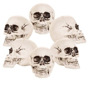 Add a touch of Halloween fun to your décor with this Set of 24 Skull Decorations! Perfectly sized to fit in your palm, each 4-inch skull is crafted from durable molded plastic and features movable jaws for added charm. These detailed skulls boast lifelike crevices and shading, making them a realistic addition to your seasonal setup. Whether you scatter them around the house, fill a cauldron, or hand them out as unique party favors, this pack of two dozen skulls will bring a memorable vibe to your festivities.
