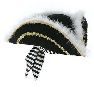 It's time to transform your child into a famous pirate! This Kid's Captain Meyer Pirate Hat has an elegant, yet dangerous style, perfect for any young pirate-in-training. The hat has a black velvet exterior with a layer of white marabou feathers along the top. The gold trim along the side adds to the elegant style to give you a hat that will go great with any pirate costume.