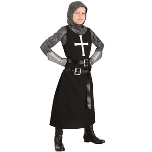 A Knight Noble and TrueKing Arthur is worried. A band of evil knights is threatening the safety of his kingdom. The Knights of the Round Table are away settling an uprising in the North, and the rogues are using the opportunity to scurry their way through the towns near Camelot. Just as the king is prepared to ride out to fight them alone, a mysterious stranger arrives at his castle. Dressed all in black armor, the unknown knight requests the honor of fighting the rebels alone. The king is concerned for his safety, but grants his wish. As he watches from the battlements, lo and behold! The knight fights with the strength of 50 men and the rogue band is put to flight!Product DetailsShow off your bravery in this exclusive Dark Knight Kid's Costume! A gray tunic protects your arms from stray blows, and a long black tabard provides ease of movement so that you can swing a lance as easily as a sword. Two belts give you room to hang your extra weapons and silver gloves let you grip those weapons securely. As a finishing touch, a matching gray hood fits snugly over your head to keep you comfortable even inside those metal helmets. The Mightiest KnightOnce you rid him of his foes, the king will surely want to reward you with half of his kingdom! The choice is yours whether you want to rule at his side or continue on your adventures. Whatever you decide, the Dark Knight is a legend that Camelot will not soon forget.