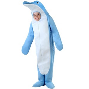 The Fun Costumes Dolphin Costume for KidsIf your child wants to experience some of the fun and magic of the ocean this Halloween, dress them up as the cutest dolphin around with our Dolphin costume for boys and girls! Our dolphin bodysuit features a light blue jumpsuit with a white belly. A dolphin face is detailed on the hood part of the suit, complete with a long nose and an appliqued mouth, eyes, and blowhole. A foam fin is attached in the back for stylish swimming. The flipper sleeves have slits so it's easy to use the hands, and the flipper shoe covers stay on with elastic bands under the feet.Product Details:100% polyester interlock knit over foam paddingLight blue jumpsuit has a white belly & front zipperAppliqued felt mouth, eyes, and blow hole on top of hoodFlipper sleeves have slits for the wrists to come outAttached flipper shoe covers have elastic band under footFoam fin on the backAbout Us:Fun Costumes are exclusively made by us and begin with passion, teamwork, and industry expertise decades in the making. Our products are proof that with the right people even a simple idea can grow into something incredible. We started in a small garage in Minnesota, providing costumes to our local community, and now we’re creating costumes for people all around the world.