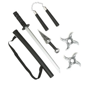 Ninja skills can get you pretty doggone far in life alone, but true ninjitsu masters know that you just don't go into battle without the tools of the trade. Namely, a complete arsenal of ninja weapons!With this set, your child won't even have to choose their weapon of choice, because this kit will give them the ability to practice and master each weapon! They can use the katana blade to clash swords with their foes, or use the dagger as a weapon in a surprise attack. A true ninja will always choose to wield the nunchucks, because they make for a genuinely powerful weapon when mastered. And of course, no assault would be complete without unleashing a lethal barrage of throwing stars to try and thin out your opponents ranks.Now, we are going to level with you, these are plastic weapons, for use as toys or costume accessories only. (Not that we'd really want your little one to be playing with real weapons anyways!) But they will add the necessary touch of authenticity to make any little guy or girl feel like a real, bonafide ninja master. Get this accessory set to complete your child's look so that they'll have all the tools of the ninja trade!