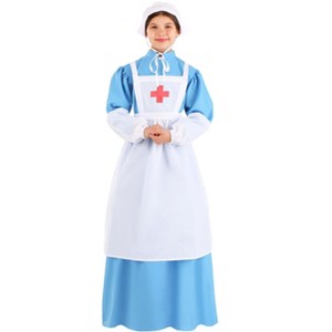 This historic costume is perfect for school events and historic occasions. The featured blue dress zips up the back while the long skirt has a built-in petticoat for a classic 1800s shape. White cuffs are layered over the billowy sleeves and a white apron is tied over the front to create a nurse's uniform from the Civil War era. The costume is complete with a tidy white bonnet to make your child ready for 19th-century nursing!