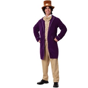 The Fun Costumes Candy Man Costume for MenWe craft costumes to help you become your best self! From outfits for Halloween and costumes based on your favorite pop culture characters, we put a lot of effort into creating costumes you can feel confident wearing. This Candy Man Costume brings you a look that's ready to make you feel like a chocolate-making master.Product Design:This adult costume comes with 5 pieces! It starts with the purple velour jacket with gold edging. The vest features brown floral patterns, giving it a playful yet elegant style. The shirt comes with an attached bow tie at the neck. The brown top hat has foam backing to help it keep its shape, and the khaki-colored pants fit with an elastic band in the waist for a comfortable fit. When you put it all together, it's a sharp look, perfect for anyone who wants to be a candy man icon!Product Details:100% polyester jacket, 100% cotton shirt, 80% polyester 20% cotton vest and pantsShirt buttons at front, hook & loop fastener for top button w/ attached bow tieVest buttons at front centerVest has a detailed pattern on frontPurple velour jacket has metallic braid edging, false pocket flapsPants have elastic waistbandFoam-backed velour hat has ribbon band. About Us:Fun Costumes are exclusively Made by Us and begin with passion, teamwork, and industry expertise decades in the making. Our products are proof that with the right people even a simple idea can grow into something incredible. We started in a small garage in Minnesota, providing costumes to our local community, and now we're creating costumes for people all around the world.