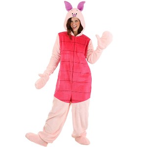 - COSTUME INCLUDES: This Disney Winnie the Pooh Deluxe Piglet Costume for adults includes a hooded Piglet jumpsuit with attached mitts and detached shoe covers.