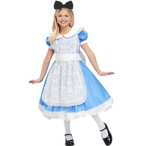 The Fun Costumes Elite Alice in Wonderland CostumeAll children have some curious qualities and the part of kids that we love the most is the look on their faces when they imagine being their favorite storybook characters. That's why when we are creating our Made by Us costumes, we want to get all the details right! From look and shape to feel and function, we aim to make sure that your child will enjoy every Wonderland second in this long-lasting Alice costume.Attention to DetailThis child's Alice in Wonderland costume features the classic look that we've all come to love of Alice from her various storybook, movie, and television appearances. This look includes her iconic blue dress with a white bow tied in the back. The petticoat keeps the skirt from falling flat and the lace apron and black headband bow just might have you thinking your child actually came through the Looking Glass!Product Details:100% polyesterGabardine dress has back zipperDress has eyelet hem edging, Peter Pan collar, large bow sewn to back waistEyelet-edged lace apron attaches to dress with hook and loop fastener strips at shouldersOrganza sash secures apron at waistPetticoat has elastic waist, multiple tiers of tulle, eyelet hem edgingBlack velvet hair bow attached to plastic headbandLace and trim is off-white/cream color. About Us:Fun Costumes are exclusively made by us and begin with passion, teamwork, and industry expertise decades in the making. Our products are proof that with the right people even a simple idea can grow into something incredible. We started in a small garage in Minnesota, providing costumes to our local community, and now we’re creating costumes for people all around the world!Help your little darling explore Wonderland for real with this Elite Alice costume!