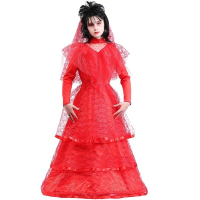 The Fun Costumes Child's Red Gothic Wedding DressWhether your kiddo wants to imagine a haunted ballroom, becoming a ghostly bride, or just wants a little gothic flair to a classic look, we're happy to offer up our Made by Us costume line to make those dreams become a reality! Red might not be the most common color for a wedding dress, but that's what makes this look such an attention-getter. We're sure it will make for a hauntingly elegant memory.Product Design:This ghastly wedding dress is designed to be comfortable and haunting all at once. The long-sleeved dress is a vivid red with multiple layers of tulle and satin. You can weave the included hoop through the underlayer to ensure a consistent shape. The veil gives a hauntingly beautiful look for a bride of the recently deceased variety. Best yet, the fabric and construction ensure an even longer costume lifetime!Product Details:100% polyester satin and interlock knit; 100% nylon tulle and laceRed satin bodice and skirt, interlock sleeves, tulle placket, lace overlaysDress has back zipperTulle V-placket edged with wide lace ruffleSkirt is 3 tiers of lace edged with satin ribbon over satin base layerPlastic hoop can be threaded into hem of skirtVeil has layers of tulle and lace, attached to satin-covered headbandAbout Us:Fun Costumes are exclusively made by us and begin with passion, teamwork, and industry expertise decades in the making. Our products are proof that with the right people even a simple idea can grow into something incredible. We started in a small garage in Minnesota, providing costumes to our local community, and now we’re creating costumes for people all around the world!This Gothic Red Wedding Dress is just the thing for a kiddo that's a perfect blend of cute and creepy!