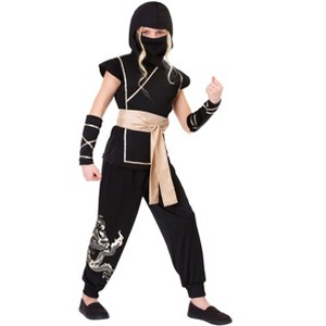 Your little one is ready to complete their shinobi training with this Guardian Ninja Costume.  The black jersey top and jogging pants have a comfortable fit and gold trim as well as a dragon print design.  The mask fits around the neck and has fabric to pull up over the face and head for a storybook ninja look.  The black gauntlets have golden trim that matches the belt sash.  Now your little ninja will just need a few weapons to complete their mission.