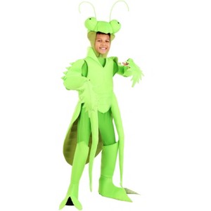 Get your bug lover a unique costume with this Praying Mantis Costume for kids. This costume includes a jumpsuit, tunic, hood, and pair of boot covers. The pullover tunic has fiber-filled front legs, arms that have hand coverings that can allow for free hands, and a headpiece that has fiber-filled eyes and wire antennae on the top.