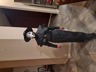 The Fun Costumes Classic Black Plague Doctor Costume for kidsWe take costumes seriously at Fun Costumes and that means we're experts when it comes to scary Halloween costume styles. That's why we're very proud to offer this exclusive Classic Plague Doctor Mask Costume. Artfully and expertly designed right in our own costume design studios, this quality costume outfit is ready to deliver the terror factor your child wants for Halloween!Product Design:This costume features a jacket with antique-gold-tone buttons at center front in 2 columns for double breasted look. The capelets hang over the shoulders, and the black belt is threaded through belt loops. The plague doctor mask fits with an elastic band around the back of the head and has black mesh-covered eye openings to see through (may obstruct vision). The mask is worn over a balaclava style hood. A brimmed faux leather hat is included as well as matching gloves and a belt, and it includes a gold-tone metal cross necklace.Product Details:100% polyester gabardine & faux leatherJacket has antique-gold-tone buttons at center frontJacket has 2nd column of buttons for double-breasted lookFaux leather belt has hook & loop fastener at back, threads through loops at waist of jacketBalaclava-style hood covers head & neck, leaves face exposedFoam-backed faux leather mask has elastic band around back of headMask has mesh-covered eye openings, will restrict visionForearm-length faux leather glovesFoam-backed faux leather hat has wire in brim edge for shapeGold-tone metal cross hangs on cord necklaceAbout Us: Fun Costumes are exclusively Made by Us and begin with passion, teamwork, and industry expertise decades in the making. Our products are proof that with the right people even a simple idea can grow into something incredible. We started in a small garage in Minnesota, providing costumes to our local community, and now we’re creating costumes for people all around the world.