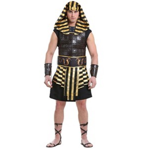 The Fun Costumes Ancient Pharaoh CostumeWe all know how great it would be to be a king, but how about the heir of ancient Egypt and the eventual deity of the sun! It's unlikely that our made by us Ancient Pharaoh costume will actually do all of that, but you may feel rather powerful while wearing it! That's because our in-house design team loves putting in all the construction details that help a costume feel authentic and look amazing.Product Design:This Ancient Pharaoh costume includes a black tunic and a faux leather chest piece that is designed to look like leather plate armor. The belt features a black tone with a pair of gold serpents. A pair of black gauntlets fit around the wrists and a neck collar with matching gold snake designs fits around the neck. The finishing piece to this outfit is the gold and black headpiece that frames your face and drapes down.Product Details:100% polyester fabricsTunic is pull on with finished hemsChest piece has a padded armor look with ties around waistCollar has printed design on front with hook and loop closure in backHeadpiece has elastic band on backBelt has attached cloth and printed design on front with hook and loop closure in backGauntlets secure with tiesAbout Us:Fun Costumes are exclusively made by us and begin with passion, teamwork, and industry expertise decades in the making. Our products are proof that with the right people even a simple idea can grow into something incredible. We started in a small garage in Minnesota, providing costumes to our local community, and now we’re creating costumes for people all around the world!Command one of the coolest ancient costumes when you go as the Pharaoh in this history-inspired costume!