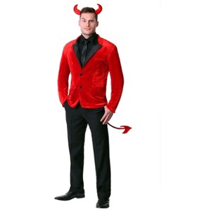 Give your hellish origins a suave twist with this velvet textured dashing devil costume. The featured jacket has two buttons in front and three faux pockets in the front. The black lapels would bring together a black dress shirt and black dress pants. The back of the jacket features an attached devil's tail. The whole look is topped off with red devil horns to make your hellish origins obvious to anyone you run into.