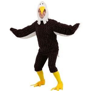 The Fun Costumes Eagle Costume for MenTransform into the majestic bird of prey with this Eagle Costume! This cozy and fun outfit will have you feeling confident as the distinguished American bald eagle. The costume comes with a faux fur top with wing-shaped sleeves and a pair of matching brown pants. The headpiece is designed to look like a bird's face, complete with eyes and a beak on top. To finish off the outfit, it comes with a pair of foot covers that make your feet look like the talons of a fierce raptor. Perfect for Halloween and 4th of July parades, you'll be ready to soar when you have this eagle ensemble on!Product Details:100% polyester felt & microfiber faux furLong-sleeved shirt fastens with hook and loop fastener tab at back of neckShirt has draped sleeves that look like wingsCropped pants have elastic at waist & cuffsEagle hood has collar; fastens under chin with hook and loop fastenerHood has appliqued felt eyes & stuffed felt beak on topYellow knee socks have elastic in top edgesYellow felt claw shoe covers have hook and loop fastener at ankle, elastic under footAbout Us:Fun Costumes are exclusively made by us and begin with passion, teamwork, and industry expertise decades in the making. Our products are proof that with the right people even a simple idea can grow into something incredible. We started in a small garage in Minnesota, providing costumes to our local community, and now we're creating costumes for people all around the world.