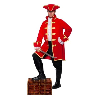 Become Captain of the High Seas: Step into the shoes of a fierce pirate captain with this exclusive Captain Blackheart Pirate Costume, meticulously crafted to stand out in any crowd. Set sail for adventure! Includes red poplin jacket with metallic gold braid trim, faux leather belt, tricorn hat, and white satin ascot.