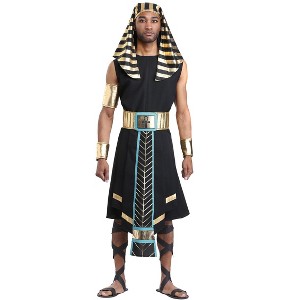 The Fun Costumes Pharaoh Costume Plus Size AdultOur Dark Pharaoh Costume is a realistic historical outfit that's perfect for Halloween, for plays and performances, and for history roleplay. In powerful black and gold, Egypt's pharaohs have never looked so good. The costume features a long black tunic that secures in back with a hook and loop fastener. A gold foam belt features a symbol at the center front and a long geometric panel with gold and turquoise accents. The costume is accessorized with gold armbands and the instantly recognizable Pharoah headdress that falls around the shoulders.Product Details:Tunic fits with a hook and loop fastener in backStriped headpiece fits with elastic bandHeadpiece measures 22" in lengthBelt secures with hook and loop fastenerBelt panel hangs down 31" inchesWrist band and arm band cuffs secure with hook and loop fastenersAbout Us:Fun Costumes are exclusively made by us and begin with passion, teamwork, and industry expertise decades in the making. Our products are proof that with the right people even a simple idea can grow into something incredible. We started in a small garage in Minnesota, providing costumes to our local community, and now we're creating costumes for people all around the world.