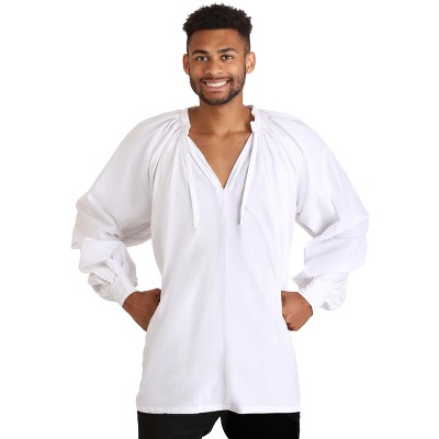 Aye, you, the strapping young man who’s wearing that ugly old sack cloth! It’s high time to get yourself – and your wardrobe – out of the dark ages ere you enter into the bright and modern age of the Renaissance. Yae we all know forsooth that sack cloth scratch-eth and itch-eth and is really just not that…fashionable-eth. But whatever will you wear on the morrow and the morrows that come after that, you ask?Prithee, turn your gaze to this fine Renaissance Peasant Shirt. Verily, it is called a “peasant” shirt because of the style, not just because only peasants wear it. Every man in the kingdom oft dons these peasant-style shirts. Are you lord of the manor? Put on our men's Renaissance trousers or breeches and a vest for the complete look of a wealthy land owner. Going out swashbuckling? Open the neck of the shirt and wear it over your leather trousers and boots. Mayhap you just want to go carousing with the other gents. Pull on your favorite manly tights, and you’ll look the part of a peasant, now.The White Renaissance Peasant Shirt is perfect for wearing while you’re huzzah-ing it up at the Renaissance fair or when you’re striding – nay, riding – into the Halloween party at the great hall. The shirt is tailored from the finest, 100% cotton with dashing, full sleeves and a ties at the neck when wearing to proper festivities. Anon and fare-thee-well until we met at yon party!