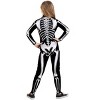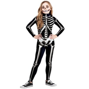 Your kiddo is ready for a bone-chillingly fun Halloween with this exclusive Kid's Metallic Silver Skeleton Costume! The costume starts with a jumpsuit made from black 4-way stretch spandex. Its frightfully fashionable design offers a comfortably snug fit that ensures your child can move with ease through their Halloween adventures. Meanwhile, the high collar and long sleeves help keep them cozy during their moonlit trick-or-treating.With a zipper closure down the length of the back offers to keep dressing easier than summoning the Halloween spirit. And a realistically detailed, silver metallic printed skeleton pattern on the front and back of the jumpsuit makes the Halloween costume a bone-a-fide showstopper! Your child will dazzle in the dark when they choose this skeleton outfit for the festivities.Whether they're shaking their bones at a monster mash or scaring up a collection of candy from the neighborhood, this Kid's Metallic Silver Skeleton Costume is a hauntingly good choice for your little ghoul! And its thoughtful, easy-to-wear design is sure to send shivers of excitement down your spine! Don't miss out on the playfully spooky sensation—order today and watch your kiddo become the life of any Halloween event, from slumber parties to family trick-or-treats!