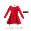 • Red crushed velvet dress has white faux collar, sleeve cuffs and hem edging