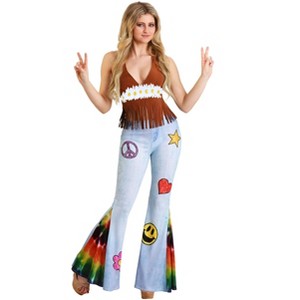 Step into the vibrant and free-spirited world of the Women's Patchwork Free Spirit costume, perfect for your upcoming costume event. This ensemble celebrates the essence of a free spirit with its playful and expressive design.The star of the outfit is a pair of flared pants that capture the carefree energy of the '60s and '70s. These pants feature eye-catching sparkly patches and tie-dye sections along the bell-bottom cuffs, ensuring you'll stand out in any crowd. With their comfortable fit and groovy style, they're a must-have for those looking to make a bold statement.The fringed halter top adds a touch of whimsy and charm to your look. It secures with convenient hook and eye patches on the back and features a delightful daisy chain along the waist, enhancing your overall vibe. The fringes sway with your every move, adding a dynamic and playful element to your costume.To complete your San Francisco-ready look, we've included a matching daisy chain headband. This accessory adds the perfect finishing touch, accentuating your free-spirited style and bringing the entire outfit together.Whether you're headed to a costume party, a retro-themed event, or simply embracing your inner free spirit, this Patchwork Free Spirit costume is the ideal choice. It encapsulates the spirit of a bygone era and allows you to express yourself with flair and confidence.Get ready to dance to the beat of your own drum and spread positive vibes wherever you go. Embrace the freedom and creativity of the '60s and '70s with this captivating costume that's sure to turn heads and transport you to a time of peace, love, and self-expression